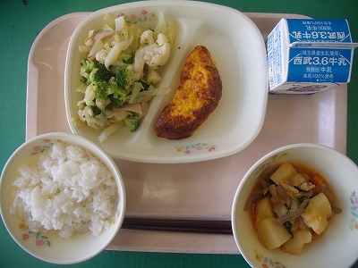 4月18日(火)の給食☆本日の献立☆ ご飯、じゃが豚キムチ、プレーンオムレツ、花野菜のサラダ じゃが豚キムチが、辛いだけでなく、ほんのり甘さも感じました。ジャガイモの甘さなのか?隠し味なのか? |