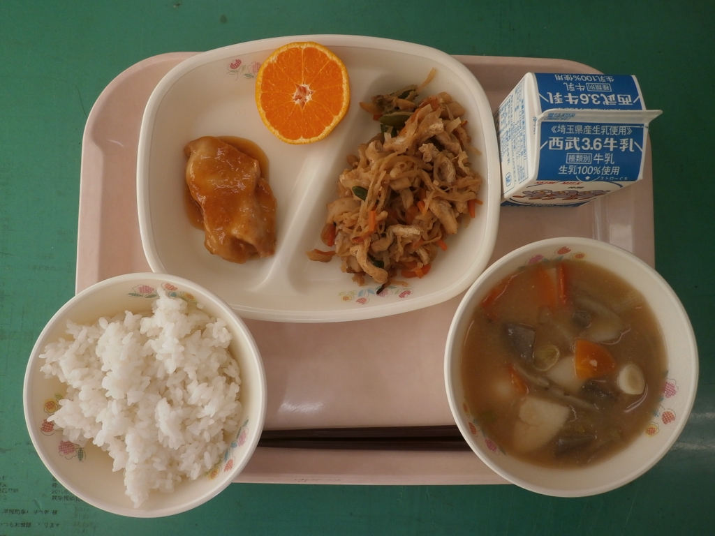 牛乳、ごはん、鶏肉のバーベキューソース 切り干し大根の炒り煮、重忠汁、花みかん