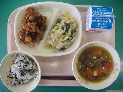 1月17日(水)の給食☆本日の献立☆ わかめご飯、豚肉のかりん揚げ、ネギぬた、けんちん汁 豚肉のかりん揚げは、かりんとうのように甘く、カリカリに揚げているので、「かりん揚げ」と名付けたのだそうです。確かに、甘く、カリカリしていました。ご飯のおかずにはちょうどよかったです。 |