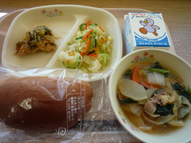 (献立) 煮ぼうとう 黒パン 鶏の香味焼き フレンチサラダ 牛乳 (コメント) 今日は、栄一翁の誕生日です。(旧暦で) ということで、煮ぼうとうが登場しました。 生麺から煮込み、トロミを出しているそうです。 野菜がもくさん摂れました。 |