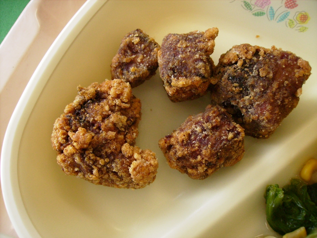 今日の献立  牛乳、ごはん、かつおの香り揚げ 青菜のソテー、みそ汁、河内晩柑 今日は、5月といえばかつおが旬の魚です。 角切りのを注文し、給食室で、酒、しょうゆ、カレー粉、しょうが で下味をしておいて、片栗粉をまぶして揚げました。