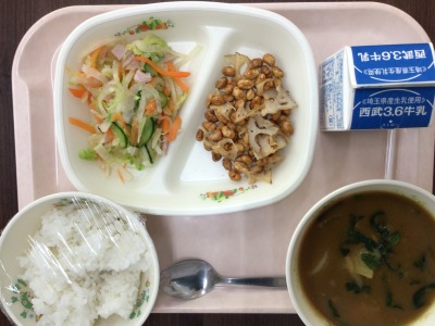 スピナッチカレー・大豆と蓮根のカリカリ揚げ・ハムと大根のサラダ