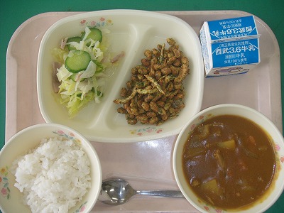 4月18日(水)の給食☆本日の献立☆ ご飯、カレー、大豆とゴボウのカリカリ揚げ、ハムのマリネ 今日から、1年生の給食が始まりました。保育園、幼稚園で食べてきた給食とちょっと違うかもしれませんが、みんなおいしそうに食べていました。いっぱい食べて、元気になって欲しいです。 |