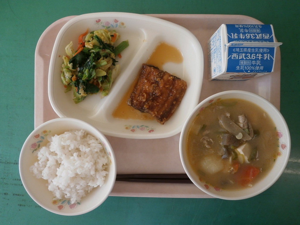 ☆今日の献立☆ 牛乳、ごはん、さんまのかばやき 豚汁、おひたし