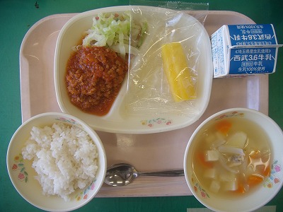 6月12日(月)の給食☆本日の献立☆ ご飯、タコライスの具、キャベツ、豆腐と野菜のコンソメスープ、カットパイン タコライスとは、タコス具材であるひき肉、チーズ、レタスなどを飯の上にのせ、サルサソースで味をつけたもの、だそうです。沖縄料理の一つらしいです。 |