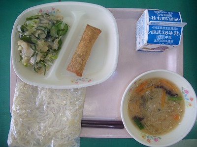 5月9日(水)の給食☆本日の献立☆ ラーメン、胡麻味噌ラーメンの汁、春巻き、海藻サラダ 胡麻味噌ラーメン。胡麻の香りと味噌の味でとってもおいしくいただきました。肌寒い今日は、温かいラーメンが嬉しかったです。 |