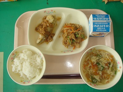 7月6日(水)の給食☆本日の献立☆ ご飯、切り干し大根の炒り煮、白身魚の南蛮漬け、かふうスープ かふうスープにはトマトが入っていて、何となくイタリアンの雰囲気がしました。南蛮漬けも、味付けがよく、ご飯に合いました。 |