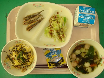 2月3日(金)の給食☆本日の献立☆ ちらし寿司、小イワシの唐揚げ、ゆでキャベツ、すまし汁、福豆 今日は節分です。昔は、柊の先にイワシの頭をさして門や玄関に飾ったものですが。今はどうでしょう?豆まきの声も最近では聞こえなくなりました。 |