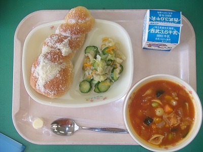 7月18日(火)の給食☆本日の献立☆ アーモンドあげパン、夏野菜のミネストローネ、キャベツとキュウリのドレッシング、チーズ 今日で1学期の給食は終わりです。無事、安全・安心な給食を提供することができました。夏休み中は、ご家庭で食育をお願いします。3食、バランスのとれた食事をすることで、体調も整いますし、よい2学期のスタートも切れます。よろしくお願いします。 |