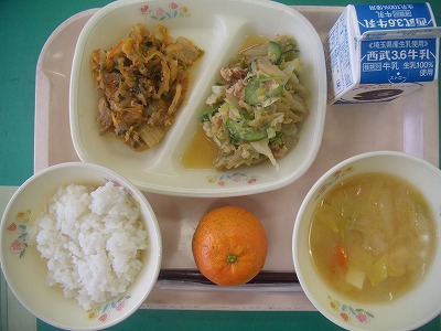 3月4日(月)の給食☆本日の献立☆ ご飯、キムタクご飯の具、ヘルシーサラダ、みそ汁、くだもの キムタクとは、キムチとたくあんです。ビリからのキムチと、ちょっと甘めのたくあんがベストマッチです。ご飯に混ぜて食べるといいですね。 |