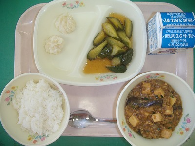 9月7日(木)の給食☆本日の献立☆ ご飯、マーボナス豆腐、エビシュウマイ、中華キュウリ マーボナスとマーボ豆腐が合体したメニューでした。肉がたっぷり、豆腐もなすもたっぷり、これだけでけっこうお腹がいっぱいになる子もいるかも知れません。 |