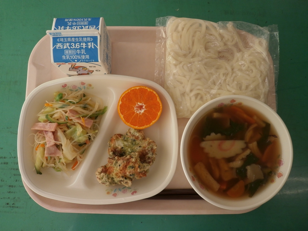牛乳、五目うどん、ちくわの石垣揚げ 中華サラダ、花みかん 今日は具がたっぷり入った五目うどんでした。 明日も出して!! と、言われました。うれしい一言です。 ちくわの石垣揚げも黒ごま、青のりが入り香りよく揚がりました。 今日はみかんも甘くておいしかったです。 インフルエンザがはやっているのでビタミンCで風邪予防です!! 中華サラダもさっぱりしていておいしかったです。 どのクラスも空っぽで返ってきました。 |