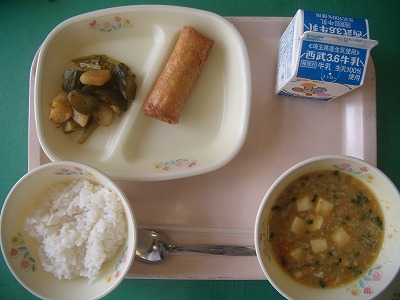 10月18日(木)の給食☆本日の献立☆ ご飯、マーボ豆腐、春巻き、キュウリとカブのピリッと漬け 今日は中華定食のようでした。春巻きはカラッと揚がっていて、ぱりぱりの食感でした。マーボ豆腐は、スープのようなさらっとした仕上がりでした。こういうのもおいしいなぁと思いました。 |