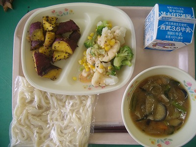 9月26日(水)の給食☆本日の献立☆ 地粉うどん、田舎うどんの汁、大学芋、花野菜のサラダ 急に肌寒くなりました。こんな日は温かいうどんがうれしいですね。具もたっぷりで、十分主食になりました。 |
