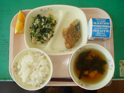 ご飯、サワラのごまみそだれ、若竹汁、青菜のソテー、オレンジ サワラはカリッと揚がっていて、ごまみそだれとよく合います。 |
