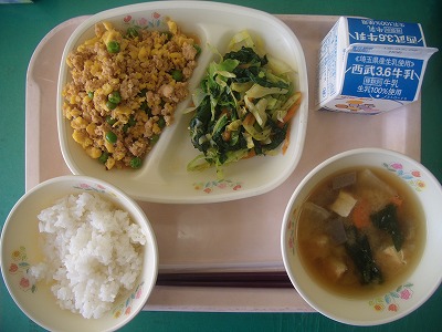 2月26日(月)の給食☆本日の献立☆ ご飯、三色そぼろ、野菜椀、おひたし 三色そぼろは、ちょっと濃いめに、甘く味付けがしてありました。ご飯に混ぜて食べるとちょうどよい味になるように調整しているのでしょう。混ぜたら、ちょうどよくなりました。 |