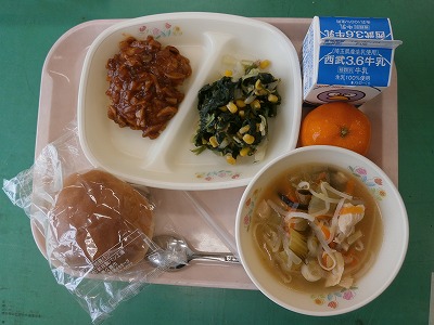 6月21日(火)の給食☆本日の献立☆ ハンバーガーパン、ハンバーグ、ほうれん草のソテー、鶏肉とフォーのスープ、冷凍ミカン 子どもたちの大好きなハンバーガーです。一方、ちょっと苦手なほうれん草。完食できるかな? |