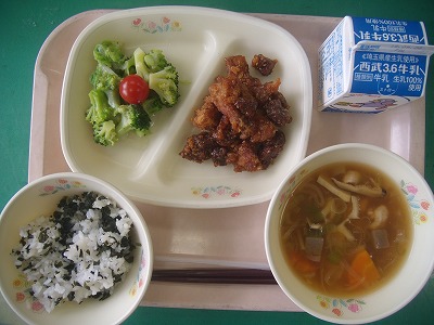 9月10日(月)の給食☆本日の献立☆ わかめご飯、豚肉とレバーのごまだれ、三色サラダ、のっぺい汁 運動会の練習真っ盛りです。わかめご飯を豚肉とレバーのごまだれで、モリモリ食べて、具だくさんののっぺい汁もおいしくいただいて、パワーを付けてほしいです。 |