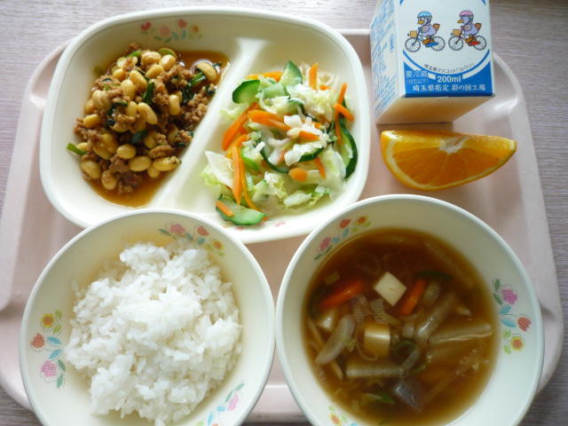 (献立) ソイ丼 たくあんサラダ けんちん汁 オレンジ 牛乳 (コメント) ソイ丼はカレー味で、とても食べやすいです。 写真にはありませんが、今日はスプーンで食べます。 「畑の肉」大豆をたくさんいただきました。 |