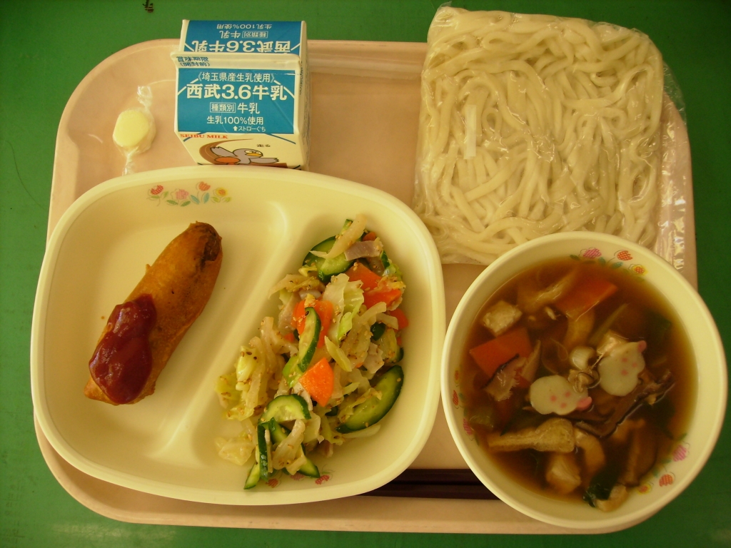 ☆今日の給食☆  牛乳、五目うどん 手作りアメリカンドッグ たくあんサラダ 今日はウィンナーにホットケーキミックスをつけて 油で揚げて、アメリカンドッグにしました。 外側がかりっと揚がっていておいしかったです。 ソースは、ケチャップとソース、辛子粉を入れて 一度煮立てて作りました。 うどんの汁には、小さな雪だるまのかまぼこが入りました。 2年生の教室に見に行くと、うれしそうに入ってるよ-と言って お箸で挟んで見せてくれました。 たくあんサラダも、さっぱりしていておいしかったです。 |