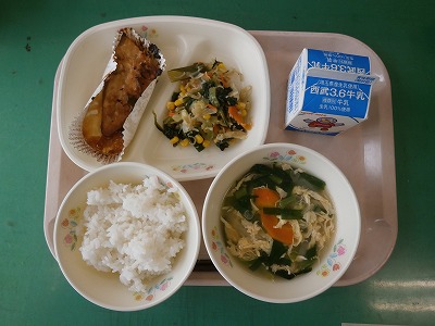 5月25日(水)の給食☆本日の献立☆ 発芽玄米入りご飯、鯖のネギミソ焼き、小松菜とじゃこの炒り煮、ニラと卵のスープ 魚が苦手な子も、今日のような味付けならおいしく食べられそうです。 |
