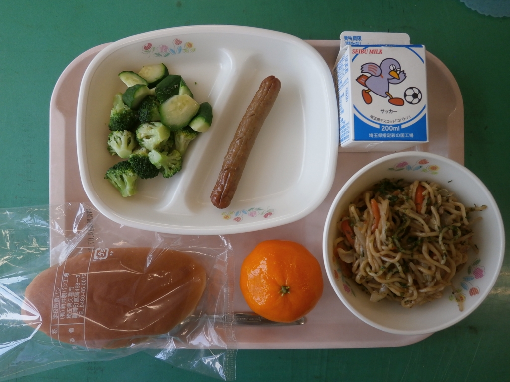 ☆今日の献立☆  牛乳、たまごパン、ソース焼きそば、 焼きウィンナー、温野菜サラダ、冷凍みかん 今日は晴れて、暑かったので冷凍みかんがおいしかったようです。 焼きそばも、野菜の甘みが出ていておいしかったです。 今日から7月に入りました。 1学期の給食もあと12回です。
