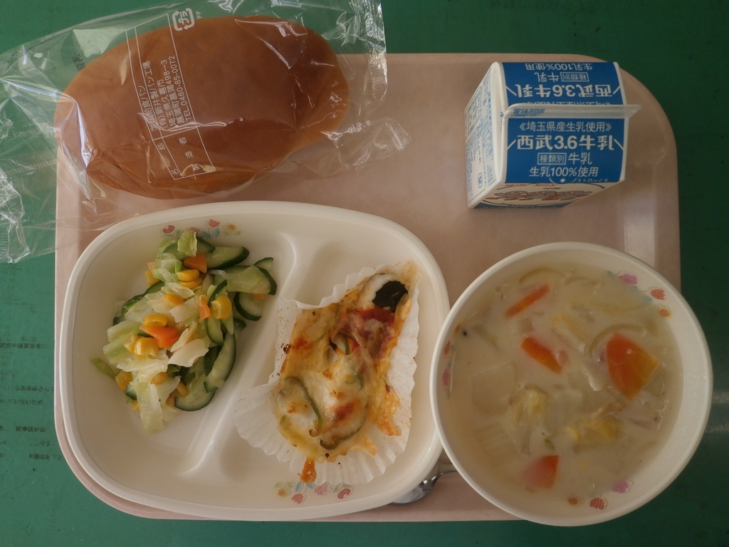 ☆今日の献立☆ 牛乳、たまごパン、白身魚ピザ風 クラムチャウダー、コールスローサラダ