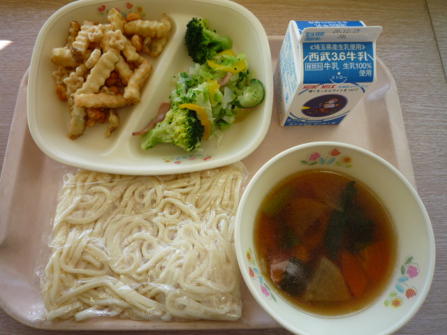 けんちんうどん・大豆とポテト揚げ・コールスローサラダ