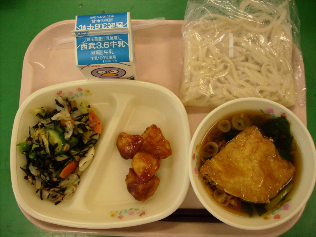 ☆今日の献立☆  牛乳、きつねうどん、みそポテト ツナとひじきのサラダ 今日は、秩父のB級グルメ、味噌ポテトを提供しました。 どのクラスもよく食べました。 甘い味噌だれと、かりっと揚がったじゃがいもが おいしかったと児童に好評でした。 ひじきはサラダに入るほうが、児童には食べやすいようです。 残りはほとんどありませんでした。 |