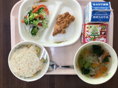少し早いですが、本日はクリスマスメニューです。本日で2学期最後の給食になりました。2学期は完食のクラスが増え、空になった食缶がたくさんみられらようになり、とても嬉しく感じていました。3学期も安心安全でおいしい給食作りをしていきたいと思います。