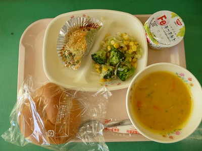 10月31日(火)の給食☆本日の献立☆ パン、チキンの香味焼、豆乳パンプキンスープ、三色サラダ、ヨーグルト 教頭:ハロウィンのパンプキンスープ、とてもコクがあり、チーズが入っているのかと思いました。とてもおいしかったです。 |