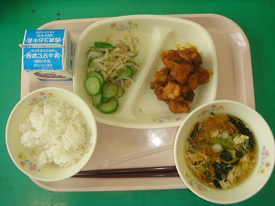 10月3日(月)の給食☆本日の献立☆ ご飯、鶏肉とカボチャのオレンジソース、じゃこと大根のサラダ、かき玉汁 鶏肉とカボチャのオレンジソースには、レバーも入っています。苦手な子もこれなら食べられそうですね。 |