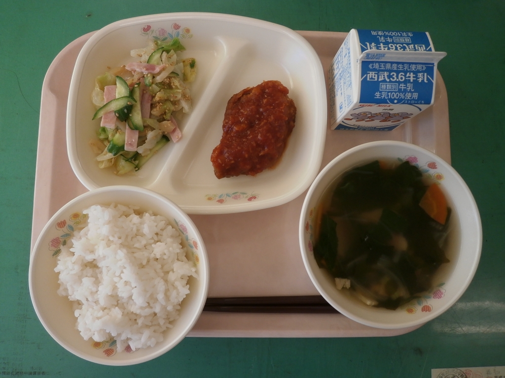 牛乳、ごはん、揚げサバのチリソース たくあんサラダ、わかめスープ