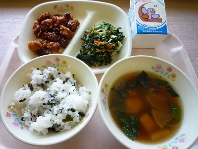(メニュー) わかめご飯 豚肉とレバーのごまだれ 磯の香あえ