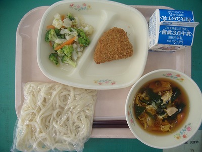 10月31日(水)の給食☆本日の献立☆ 地粉うどん、卵とじうどんの汁、カボチャコロッケ、温野菜 カボチャコロッケ。外はカリッカリ、中はふんわり。とってもおいしかったです。やっぱり揚げたてはいいですね。 |