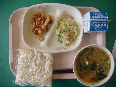 4月12日(水)の給食☆本日の献立☆ 中華麺、担々麺スープ、大豆とポテトの煮揚げ、たくあんサラダ 今日から、2~6年生の給食が始まりました。本年も、おいしくて、安全・安心な給食が提供できるようにしてまいります。保護者の皆様のご理解、ご協力をお願いいたします。 |