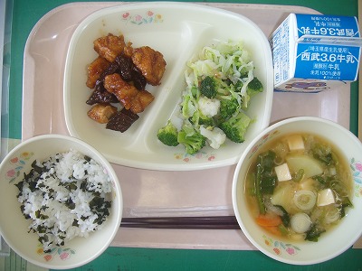 6月25日(月)の給食☆本日の献立☆ わかめご飯、鶏肉とレバーのオレンジソース、花野菜のサラダ、みそ汁 今日は暑くなりました。熱々のみそ汁で少し汗をかいて、涼しくなれました。鶏肉とレバーのオレンジソースは、甘く煮付けてあって、レバーが苦手な子でもおいしく食べられたと思います。 |