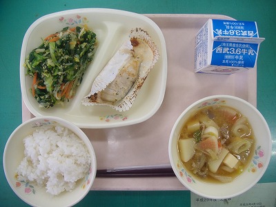 1月22日(月)の給食☆本日の献立☆ ご飯、鰆のめんたいマヨ焼、切り干し大根の胡麻和え、豚汁 今日は雪が降る予報。寒い日に温かくて、栄養満点の豚汁で体がよく温まりました。 |