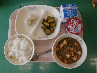 ご飯、麻婆豆腐、エビシュウマイ、中華キュウリ、ヨーグルト 今日は中華メニューです。中でも、中華キュウリがピリ辛でとてもおいしいです。 |