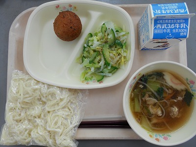 10月24日(水)の給食☆本日の献立☆ ラーメン、醤油ラーメンの汁、おからドーナツ、野菜のドレッシングかけ 中々食べる機会のなくなってきたと思われるおからも、このようにドーナツにしてあげると、おいしく食べられるものですね。 |