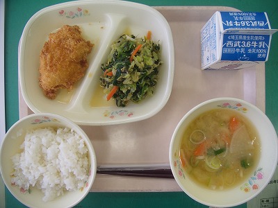 2月28日(木)の給食☆本日の献立☆ ご飯、とりカツ、磯の香和え、みそ汁 今日のみそ汁は、玉ねぎがたっぷり入っていました。あまいみそ汁でした。とりカツも、カラッと揚がっていて、厚い肉なので元気が出そうです。