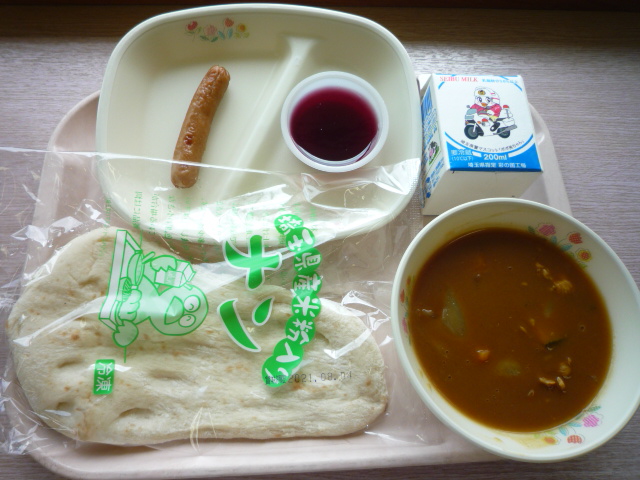 ナン・夏野菜カレー・焼きウインナー・ぶどうゼリー