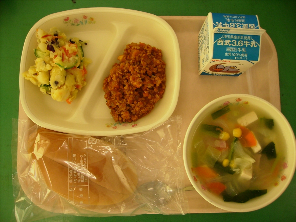 牛乳、スラッピージョー、スイートポテトサラダ 豆腐と野菜のコンソメスープ