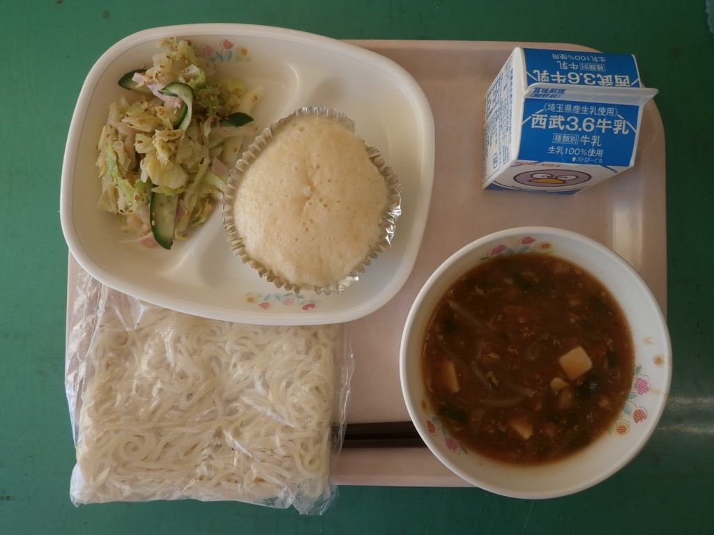 ☆今日の献立☆ 牛乳、麻婆ラーメン、リンゴ蒸しパン たくあんサラダ