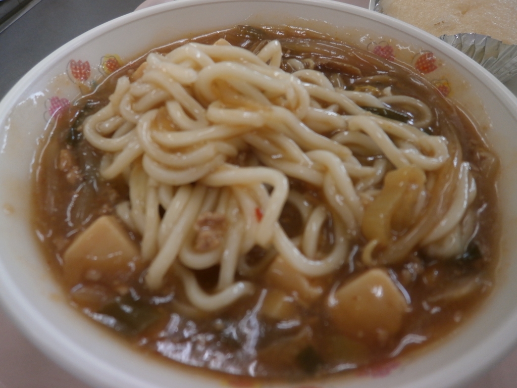 今日の麻婆ラーメンは今月の新メニューでした。 麻婆豆腐をラーメンのスープにアレンジした料理です。 とろみのついたピリ辛スープがめんに良く絡んでおいしかったです。