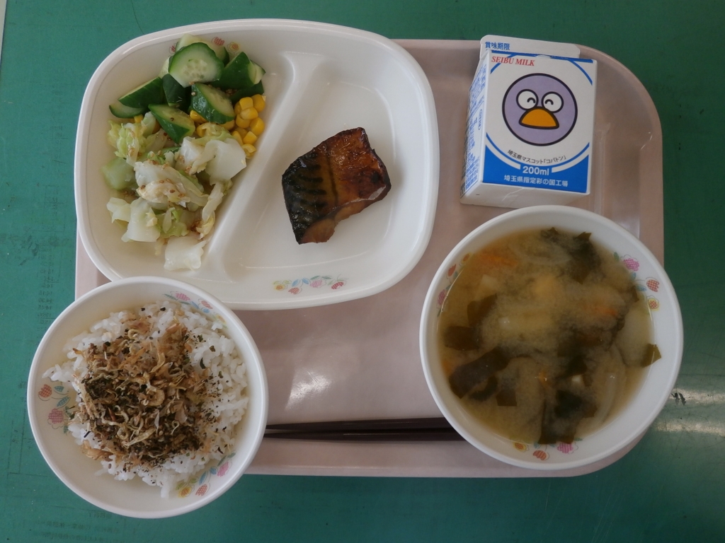 ☆今日の献立☆  牛乳、ごはん、手作りふりかけ、みそ汁 さばサラサ焼き、温野菜サラダ さばのサラサ焼きは、カレー味がしっかりついていて 魚の苦手な子でも食べやすかったようです。 カレー粉などのスパイスには、魚や肉の臭みを消す役割とともに、 その香りが食欲をそそります。 暑い夏、食欲がない時に使うといいですね。 手作りふりかけは、カルシウムがたっぷり。 じゃこ、さくらえび、ごま、かつお節、青のり、ゆかり、せん茶を釜で から煎りして作っています。塩などは添加していません。