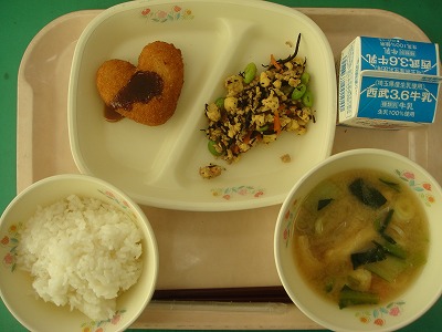 2月13日(月)の給食☆本日の献立☆ ご飯、ハートコロッケ、ひじきのそぼろ煮、玉ねぎのみそ汁 今日の「ひじきのそぼろ煮」は新メニューです。甘くて、ご飯に混ぜて食べるとおいしいと思いました。 |