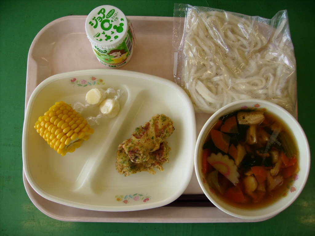 今日の献立  セレクトジョア、五目うどん ちくわの磯辺揚げ カットコーン、チーズ2個 今日は1年生にとうもろこしの皮むきをお願いして カットコーンを提供しました。 それから、今月はお楽しみ給食でセレクトジョア、 プレーン、ストロベリー、マスカットの3種類から好きなものを 選んでもらいました。1番人気は、ストロベリーでした。 この日の給食は、みんな朝から楽しみにしていたようでした。 |