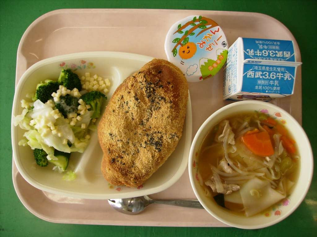 | | 2015/06/16 | 6月16日の給食~黒ごまきな粉揚げパン |  | by:栄養士 |