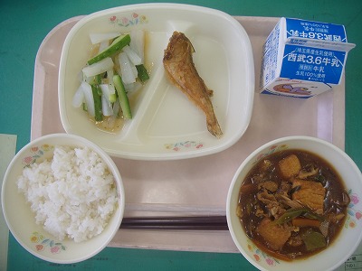 10月11日(木)の給食☆本日の献立☆ ご飯、ジャーチャン豆腐、ハタハタの唐揚げ、スティック野菜 ジャーチャン豆腐は、熱々で、涼しい日なので体が温まりました。ハタハタの唐揚げも、よく揚がっていて、骨まで食べられました。 |